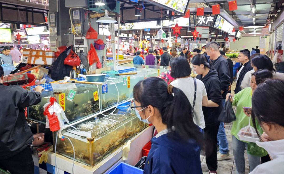 早上八点,记者走访城区农批市场、肉菜市场看到,蔬菜区品种繁多,肉食区货品充盈,水产区鱼虾欢跃,前来采购的市民络绎不绝。“今晚打算做六个菜,有虾、鱼、扣肉、鸡、鱼腐等,一家人开开心心吃个团年饭。”市民黎先生高兴地说。